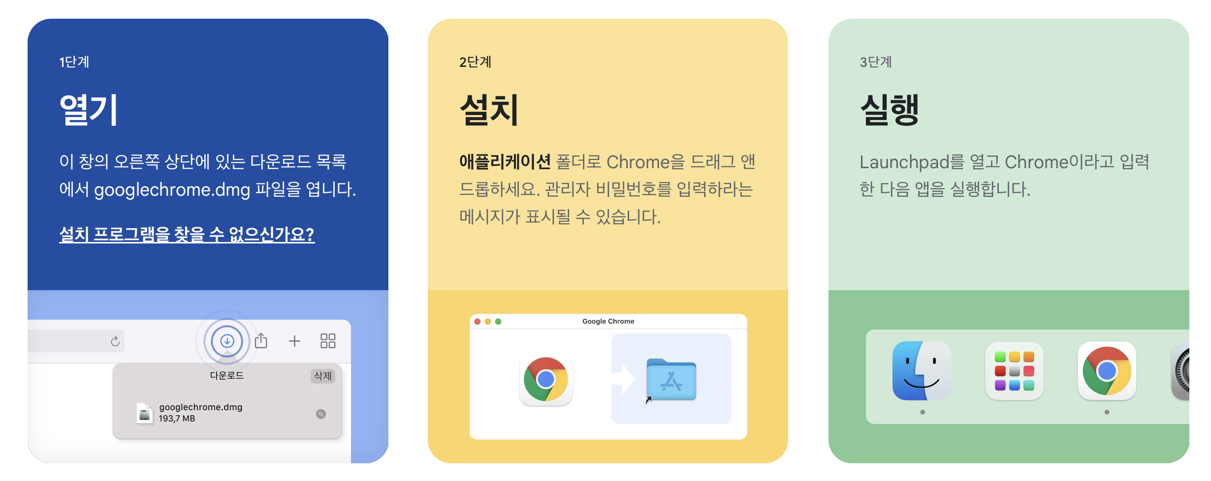 Launchpad라고 위의 모양처럼 생긴 게 있는데, 그걸 열면 크롬이 생긴 걸 알 수 있습니다. 앞으로 쓰실 때 그걸 이용하면 됩니다.
